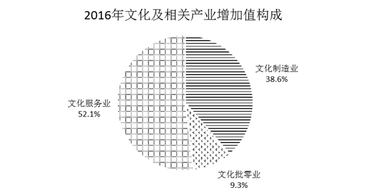 按行業(yè)分,2016年文化制造業(yè)增加值為11889億元,比上年增長7.6%,占文化及相關產業(yè)增加值的比重為38.6%;文化批發(fā)零售業(yè)增加值為2872億元,增長13.0%,占9.3%;文化服務業(yè)增加值為16024億元,增長17.5%,占52.1%。