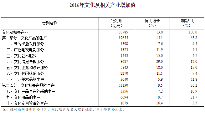 數(shù)據(jù)顯示,根據(jù)《文化及相關產業(yè)分類(2012)》和《文化及相關產業(yè)增加值核算方法》的規(guī)定和要求,經核算,2016年全國文化及相關產業(yè)增加值為30785億元,比上年增長13.0%(未扣除價格因素,下同),比同期GDP名義增速高4.4個百分點;占GDP的比重為4.14%,比上年提高0.17個百分點。2016年文化及相關產業(yè)保持平穩(wěn)快速增長,比重穩(wěn)步上升,對促進經濟轉型升級、平穩(wěn)健康可持續(xù)發(fā)展發(fā)揮了重要作用。