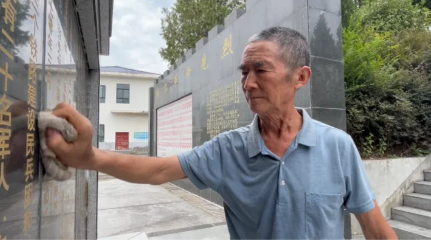 9月5日,守陵人王開茂在烈士陵園擦拭紀(jì)念碑。(圖片來源:嵐皋縣融媒中心)