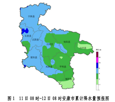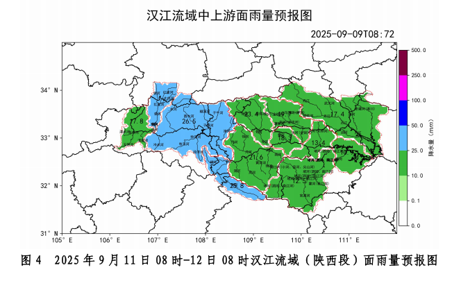 預(yù)計10日08時-11日08時漢江流域(陜西段)大部面雨量0.1~10毫米,玉帶河、酉水河、子午河、任河流域面雨量10-25毫米,褒河流域面雨量25-50毫米(圖3);11日08時-12日08時漢江流域(陜西段)褒河、酉水河、子午河、任河面雨量25~50毫米,其余中小河流流域面雨量10~25毫米(圖4);12日08時-13日08時漢江流域(陜西段)任河、堵河流域面雨量達10~25毫米,其余中小河流流域面雨量0.1~10毫米(圖5)。