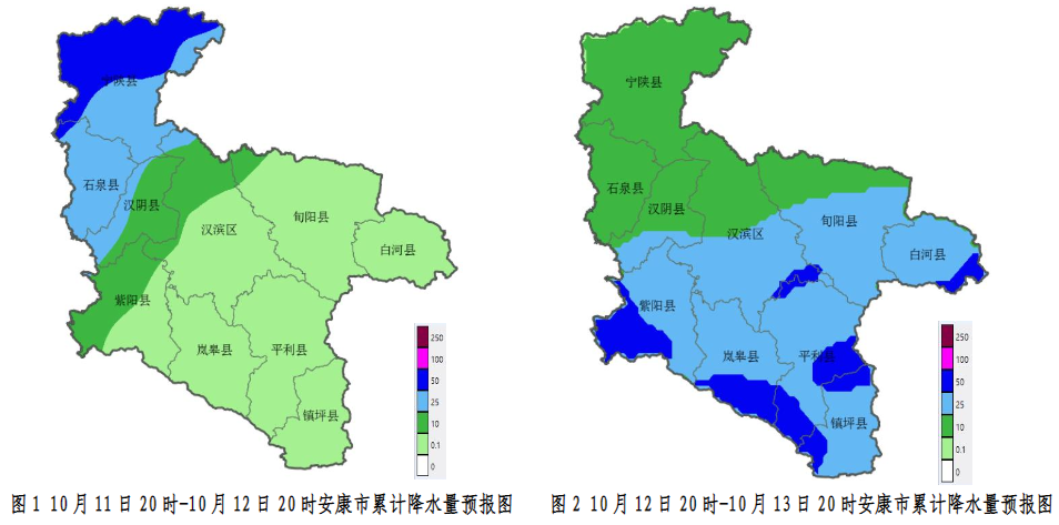 10月12日:全市大部陰天轉(zhuǎn)大雨(25~45毫米),紫陽大部、嵐皋南部、平利中南部、鎮(zhèn)坪、漢濱南部、白河局地有暴雨(超過50毫米),過程期間局地伴有雨強超過10毫米/小時的強降水;