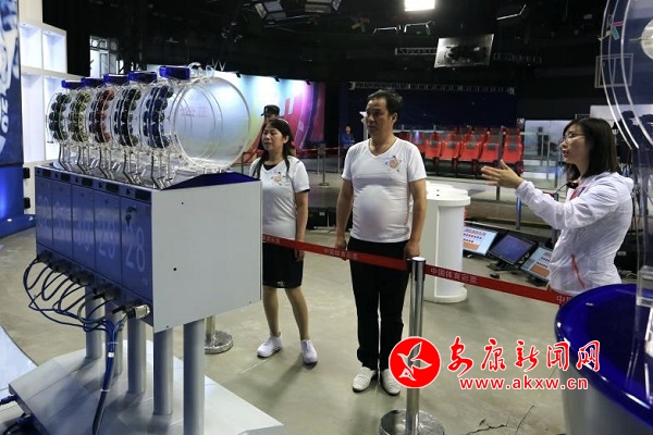 19時(shí),安康觀摩團(tuán)在工作人員的指導(dǎo)下,進(jìn)行了嚴(yán)格有序的安檢工作。每個(gè)人都需要將隨身所帶物品全部放入存儲(chǔ)柜。所有人員安檢結(jié)束后,通過(guò)專用通道,憑實(shí)名認(rèn)證的通行證進(jìn)入開獎(jiǎng)直播大廳。待大家整齊落座開獎(jiǎng)直播大廳后,工作人員再次講解注意事項(xiàng),并邀請(qǐng)觀摩團(tuán)收看了開獎(jiǎng)場(chǎng)地介紹、開獎(jiǎng)流程、數(shù)據(jù)封存及搖獎(jiǎng)設(shè)備四個(gè)短視頻。工作人員還將試機(jī)球發(fā)給觀摩團(tuán)成員,讓大家真實(shí)感受搖獎(jiǎng)球的質(zhì)地,四名幸運(yùn)站長(zhǎng)被邀請(qǐng)到臺(tái)上零距離參觀搖獎(jiǎng)設(shè)備。