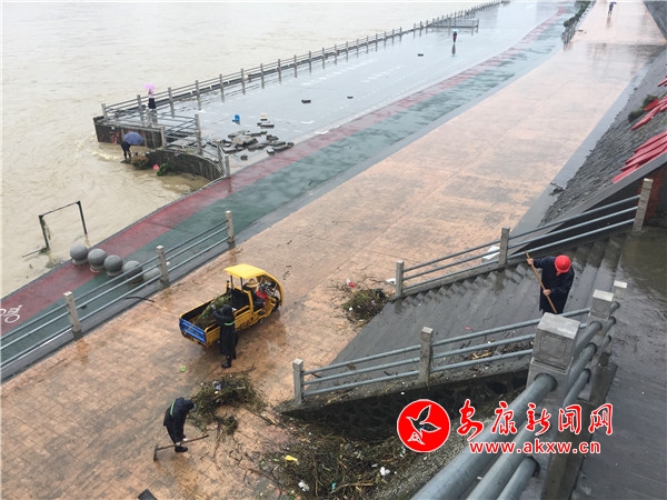 記者在現(xiàn)場看到,隨著汛情的穩(wěn)定,水位在逐漸下降,大水帶來的垃圾給漢江邊的人行步道、廣場帶來了嚴重污染,市政園林處在密切關注水位變化的同時,及時調(diào)配人員及車輛清理各處被淹步道和親水平臺。漢江公園東面的部分步道由于地勢較低,還浸在水中,水體泥沙渾濁,水面上存在垃圾和漂浮物。公園西面隨著水位下降,沿岸的步道得以“重見天日”。洪水過后,沿江有些樹木折斷,部分基礎設施被毀,一些塑料垃圾掛在綠化帶的草坪和樹木上。工作人員身穿雨衣,手拿掃把、鐵鍬冒雨清理垃圾和淤泥,經(jīng)過工作人員的努力,清理過后的步道基本恢復的比較干凈。