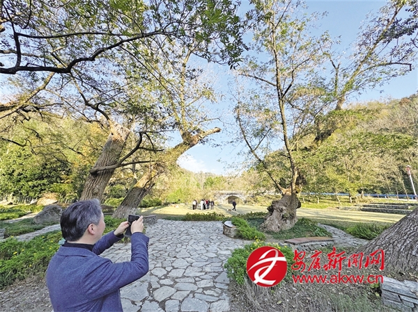 隨后采訪團(tuán)驅(qū)車駛?cè)腚p嶂村,一眼看見高大的“麻柳”古樹。據(jù)悉,這些古樹一共16棵,樹齡約500年。古樹的枝干或挺拔如衛(wèi)士,或斜臥似老者,繁密的枝葉織成巨傘,將整片草坪籠在樹蔭里。樹下游客紛紛舉起相機(jī)拍照,快門聲伴著歡聲笑語(yǔ)。