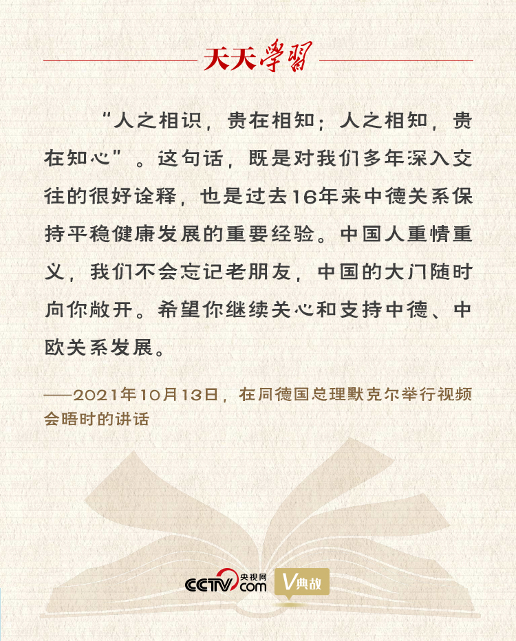 10月13日,習(xí)近平主席同德國(guó)總理默克爾舉行視頻會(huì)晤。雙方在友好的氛圍中回顧近年中德、中歐關(guān)系發(fā)展并就相關(guān)問題深入交換意見。習(xí)主席積極評(píng)價(jià)默克爾任內(nèi)為推動(dòng)中德、中歐關(guān)系發(fā)展所作的貢獻(xiàn),并引用“人之相識(shí),貴在相知;人之相知,貴在知心”,稱這句話“既是對(duì)我們多年深入交往的很好詮釋,也是過去16年來(lái)中德關(guān)系保持平穩(wěn)健康發(fā)展的重要經(jīng)驗(yàn)”。