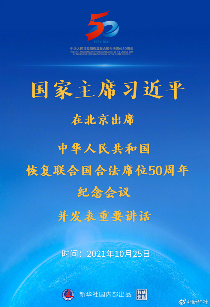 權(quán)威快報丨習近平出席中華人民共和國恢復(fù)聯(lián)合國合法席位50周年紀念會議并發(fā)表重要講話