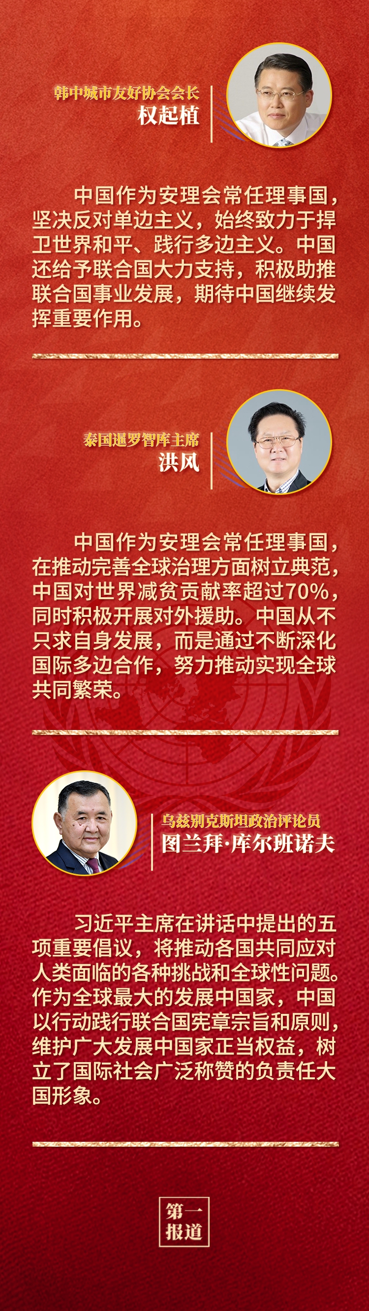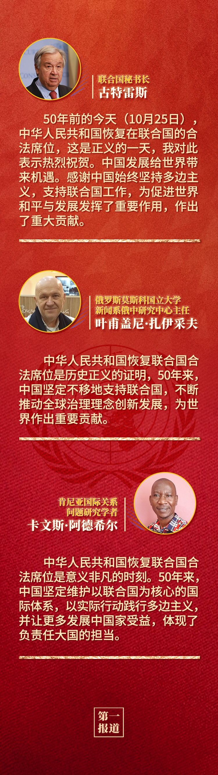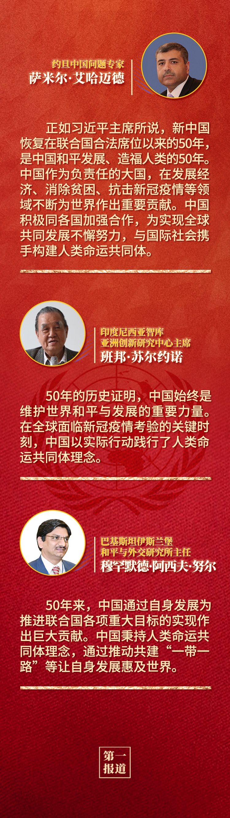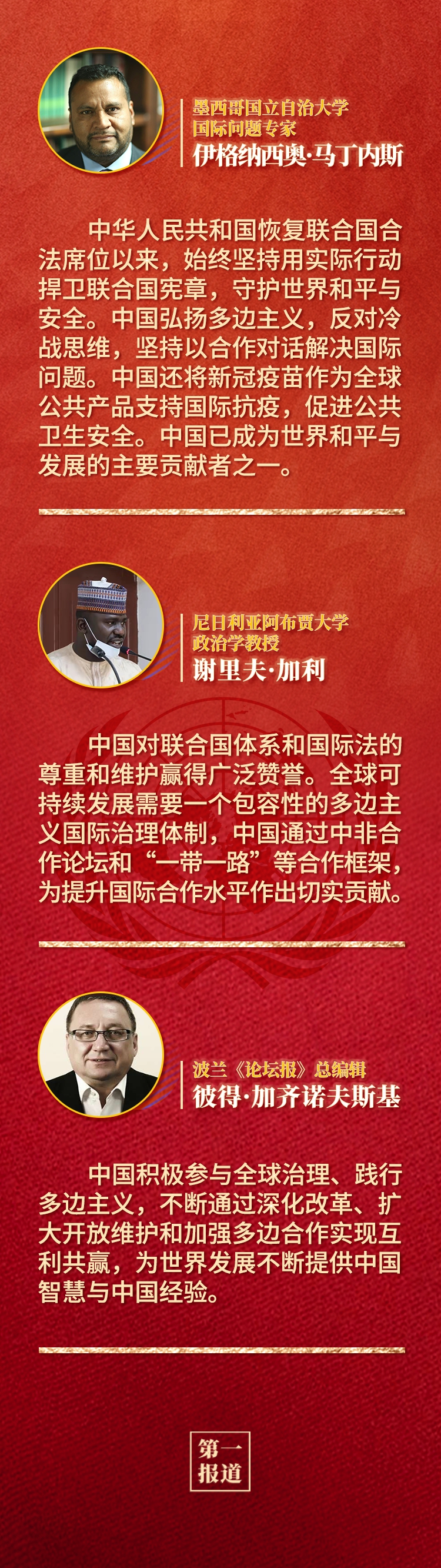 多國人士認為,中華人民共和國恢復聯合國合法席位是世界和聯合國歷史上的一個大事件,習近平主席的重要講話回顧了中國和平發(fā)展、造福人類的50年,為實現世界永續(xù)和平發(fā)展提出重要倡議,為全球共同推動構建人類命運共同體注入新的強大動力。