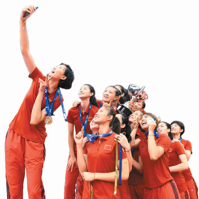 | 圖為中國女排球員與大冠軍杯獎(jiǎng)杯合影。 |