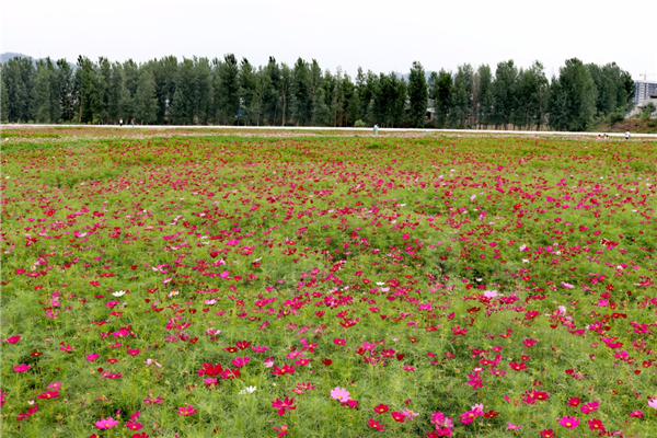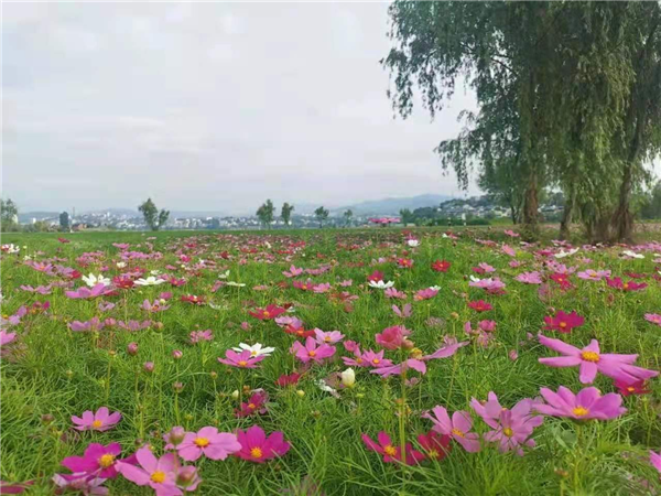 花卉種類:格桑花、千日紫、火焰雞冠花、萬(wàn)壽菊、百日草、向日葵;還有月季玫瑰樹等。