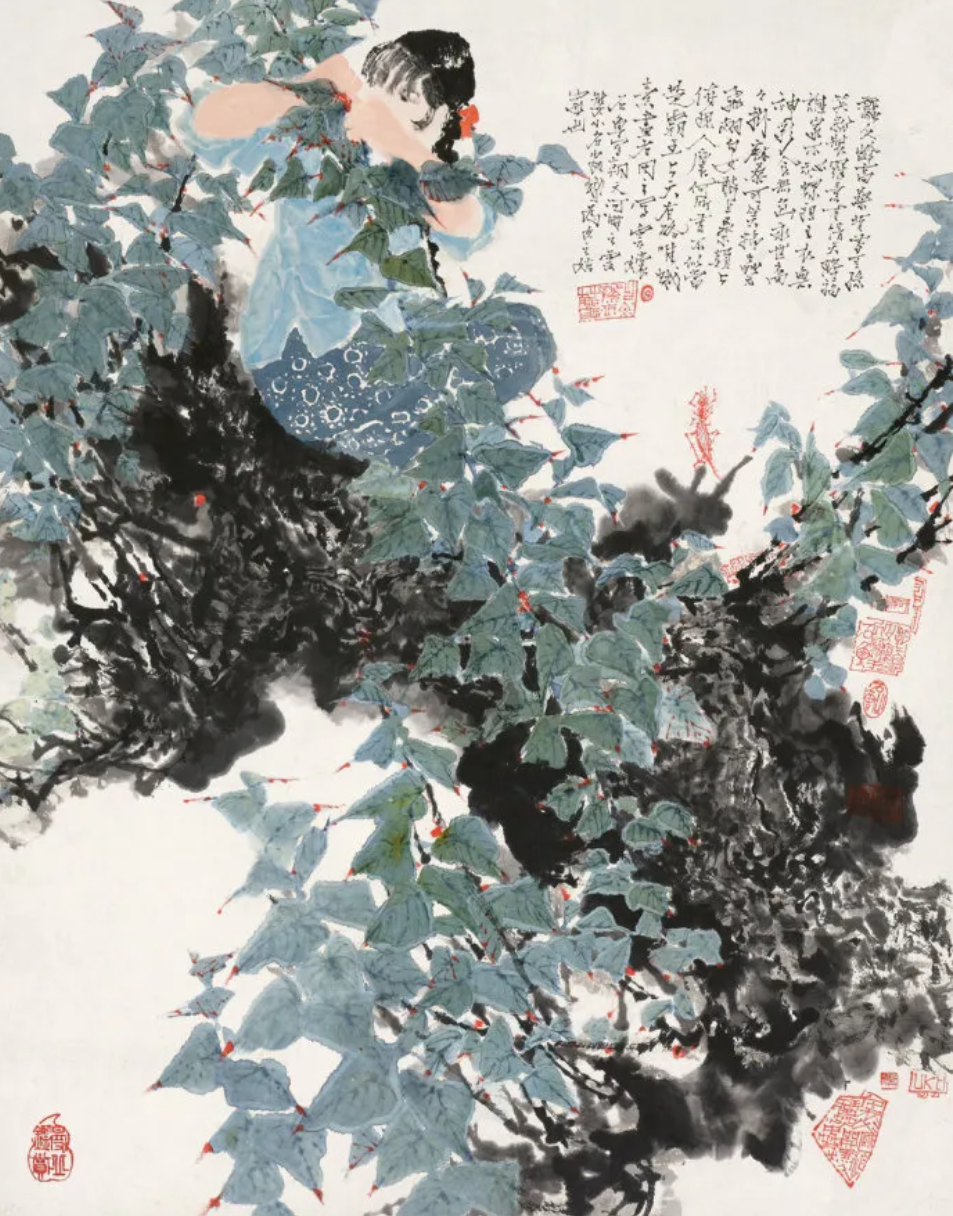 題識:蠶女齡喬桑,昔有王孫笑粉妝。羅素有情天降福,誰家不秘王祖。衣無神采食無魚,永世商裔掛麻桑?尚γ尴x無飛翅,白女敢上桑顛上。俯視人寰何所有,不似當(年)楚霸王。上天有路唯蛾素,畫者因之寫云。石魯寫朝天河畔之云婆,小名安蛾,為女之姑家也!恫缮D》,2010春拍成交價1064萬元。